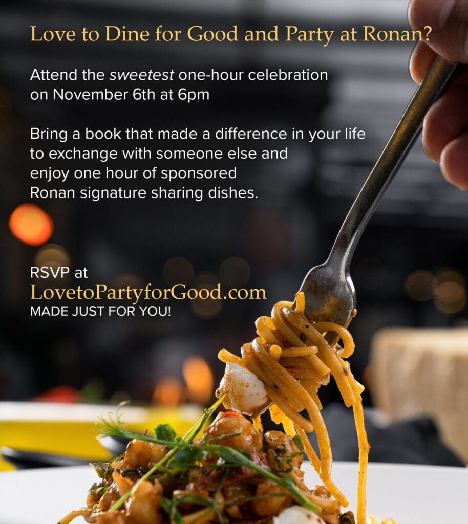 Simply bring a book that made a difference in your life to exchange with someone else to enjoy sponsored sharing dishes at Ronan Restaurant for one hour!"